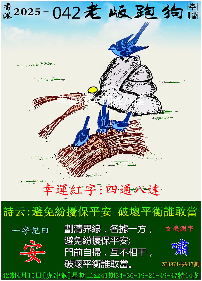 | 主题 :042期老版跑狗一字記之曰:【嘯】 玄機測字:《安》 |
