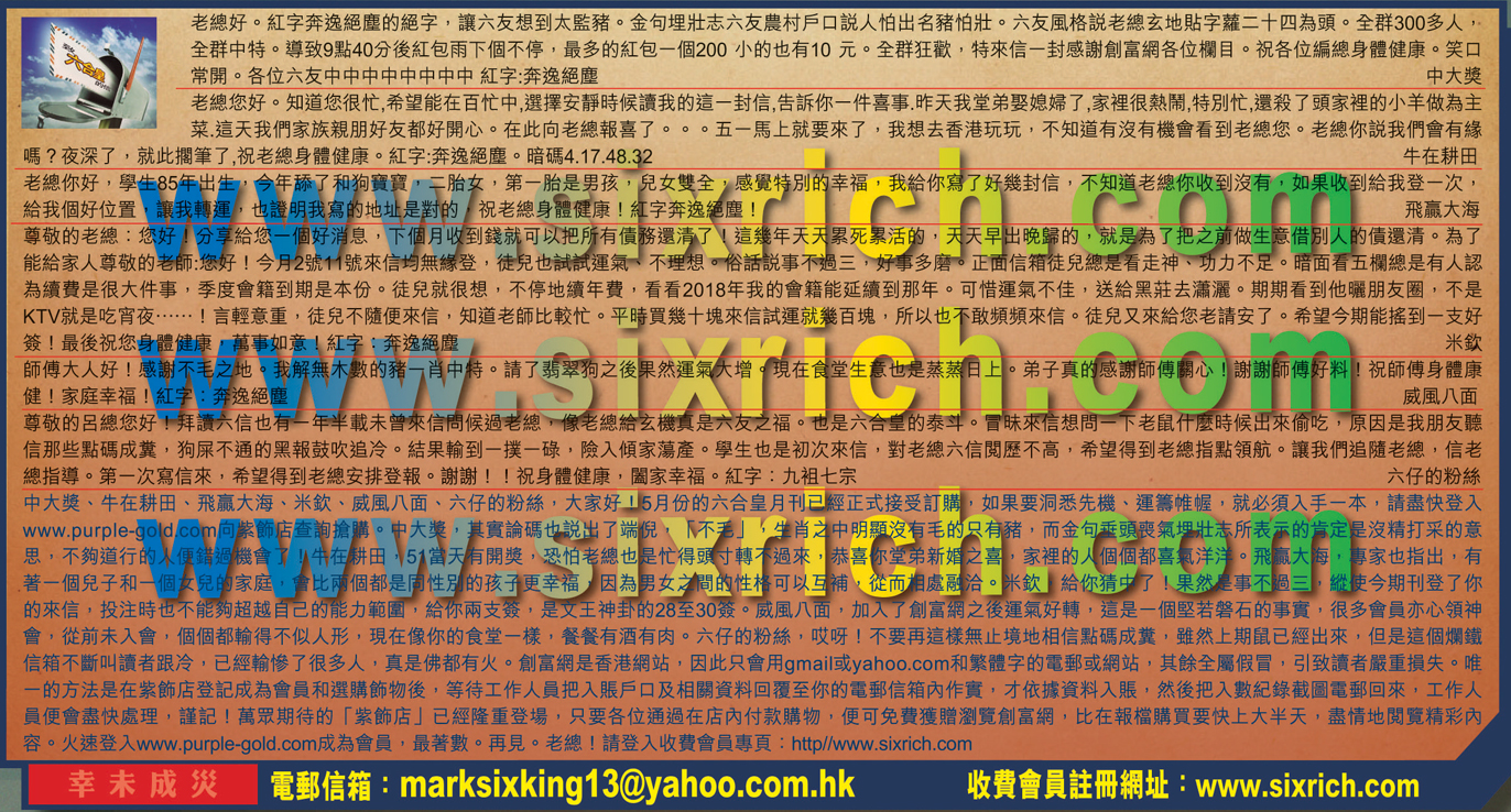 【6】尊敬的呂總您好!拜讀六信也有一年半載未曾來信問候過老總,像老總給玄機真是六友之福。也是六合皇的泰斗。冒昧來信想問一下老鼠什麼時候出來偷吃,原因是我朋友聽信那些點碼成糞,狗屎不通的黑報鼓吹追冷。结果輸到一撲一碌,險入傾家蕩產。學生也是初次來信,對老總六信關歷不高,希望得到老總指點領航。讓我們追隨老總,信老總指導。第一次寫信來,希望得到老總安排登報。谢謝! !祝身體健康,闔家幸福。紅字九祖七宗 ---六仔的粉絲