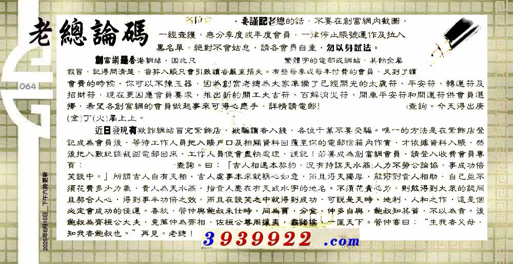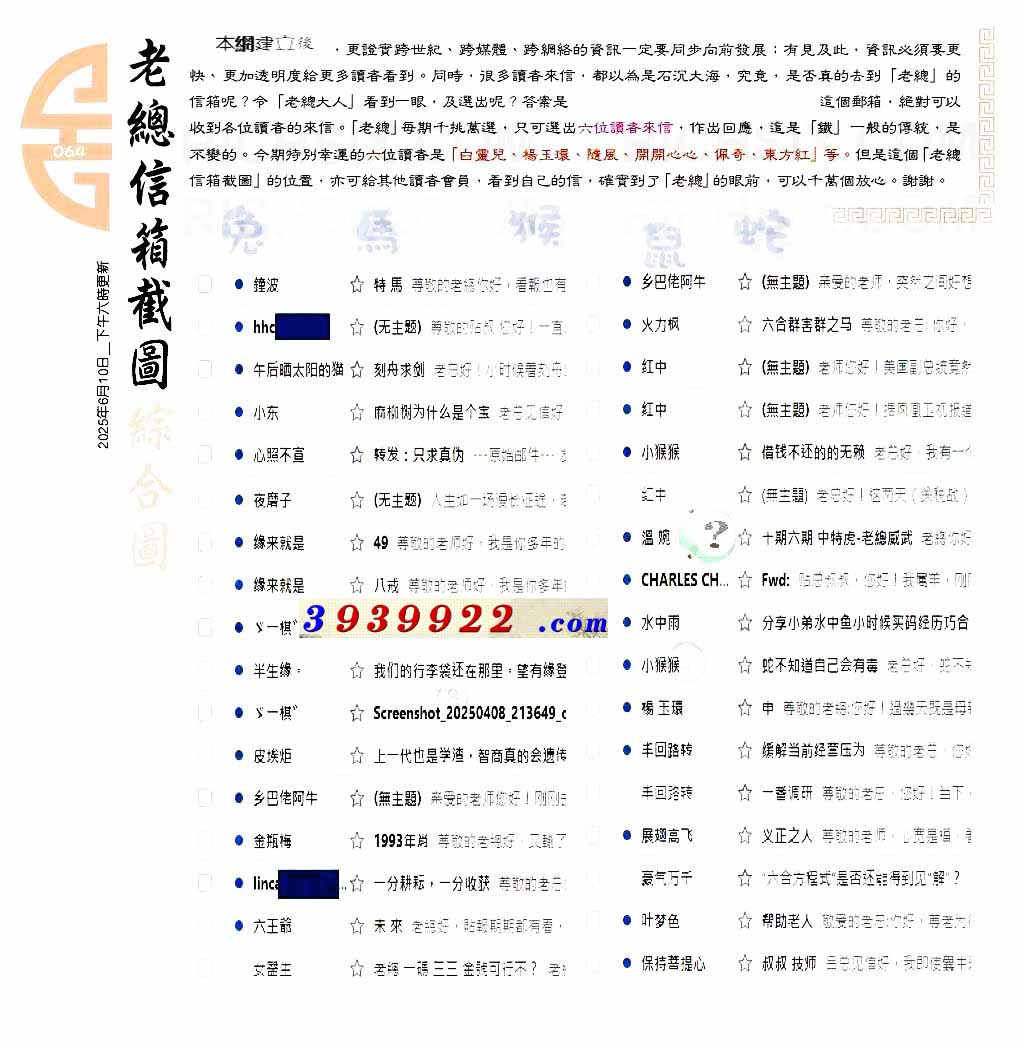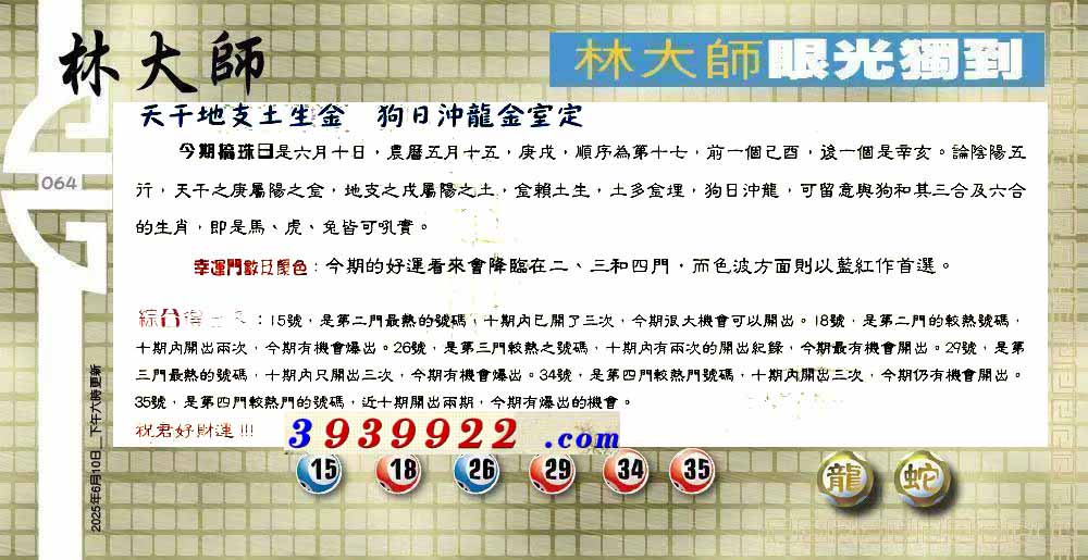 | 主题 :064期:六合皇金句/老总论码/萧公子/林大师/五行夺码/老总信箱截 |