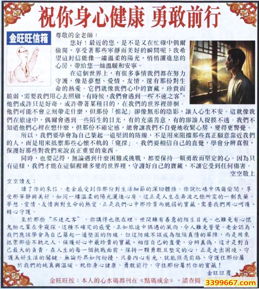 | 主题 :065期:金旺旺信箱彩民推荐→→《祝你身心健康 勇敢前行》 |