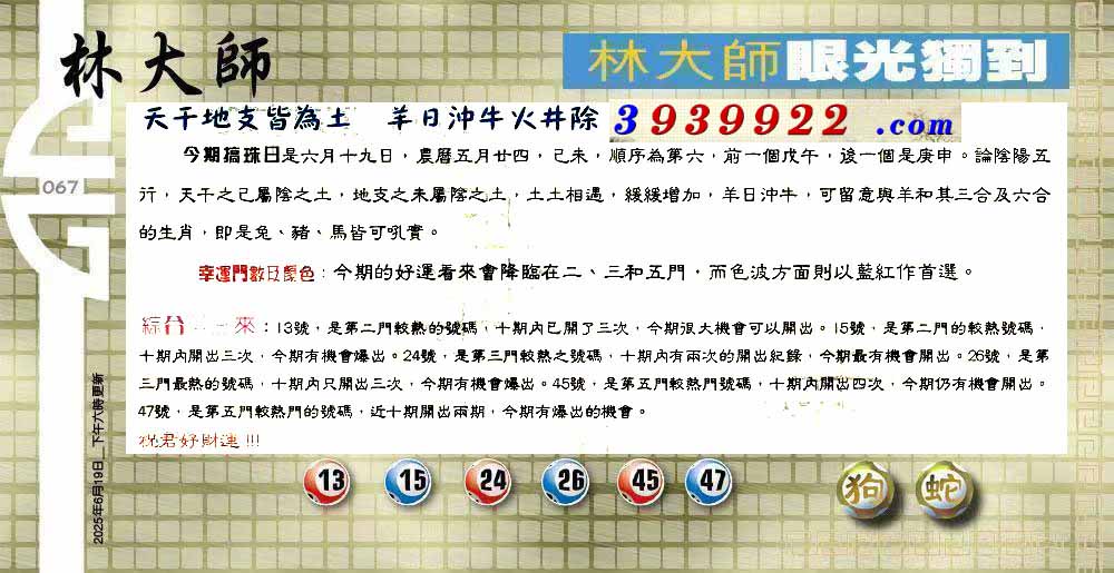 | 主题 :067期:六合皇金句/老总论码/萧公子/林大师/五行夺码/老总信箱截 |