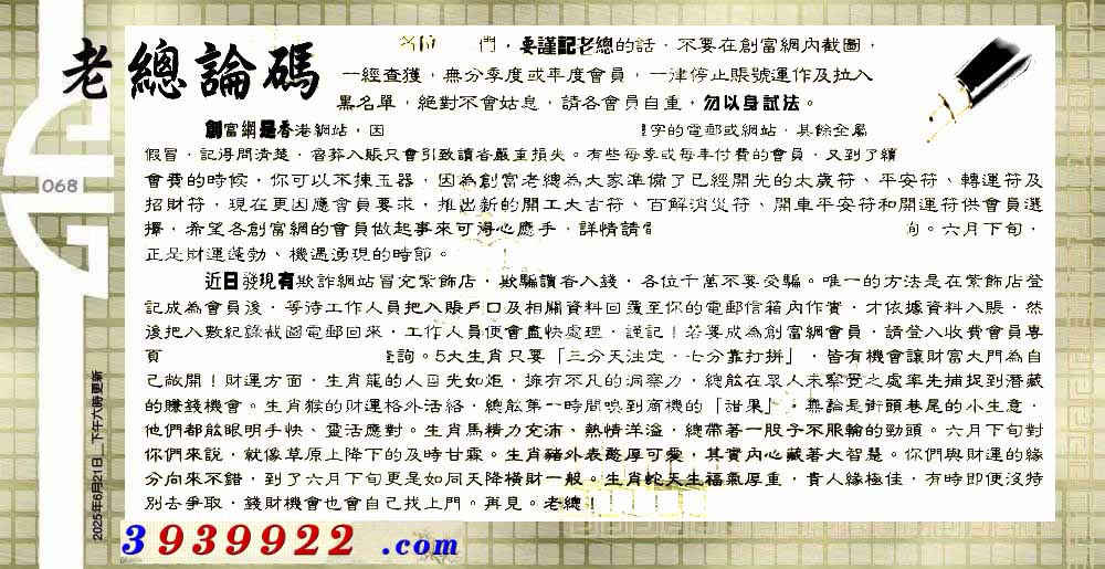 | 主题 :068期:六合皇金句/老总论码/萧公子/林大师/五行夺码/老总信箱截 |