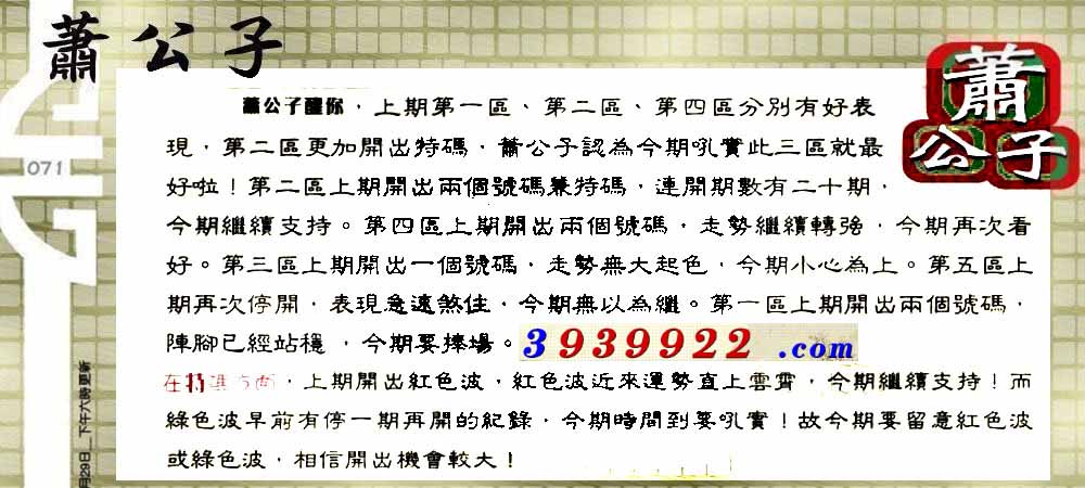| 主题 :071期:六合皇金句/老总论码/萧公子/林大师/五行夺码/老总信箱截 |