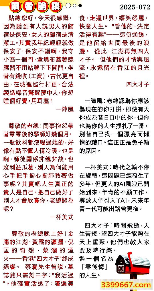 3.尊敬的老總晚上好!金庸的江湖、黃露的瀟灑、倪匡的奇想、蔡瀾的煙火一香港“四大才子”終成絕響。蔡瀾先生曾說,墓諾銘只需刻三字:“我活過”。他確實活透了:嚐遍美食, 走遍世界,嬉笑怒罵,快意人生。”管他的,決定活得有趣”— —這份通透,是他留給世間最後的浪漫。從此,江湖再無四大才子。但他們的才情與風流,永遠留在香江的月光裡。====四大才子