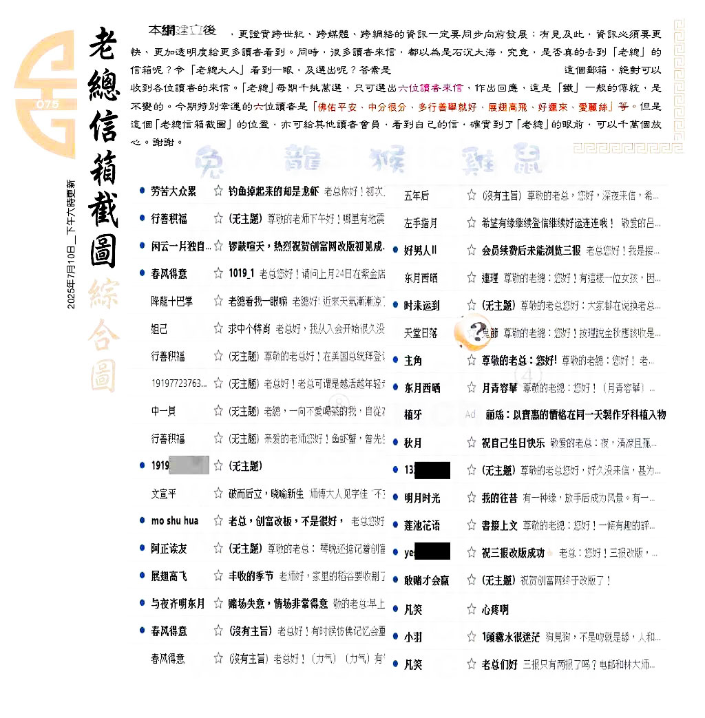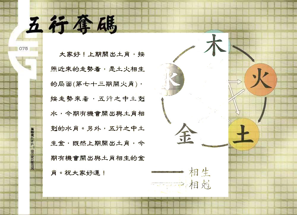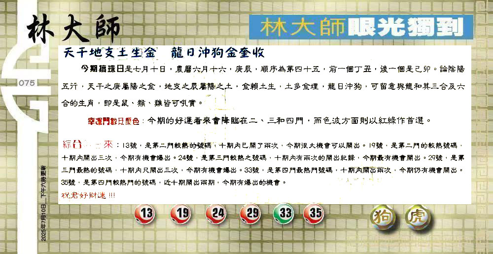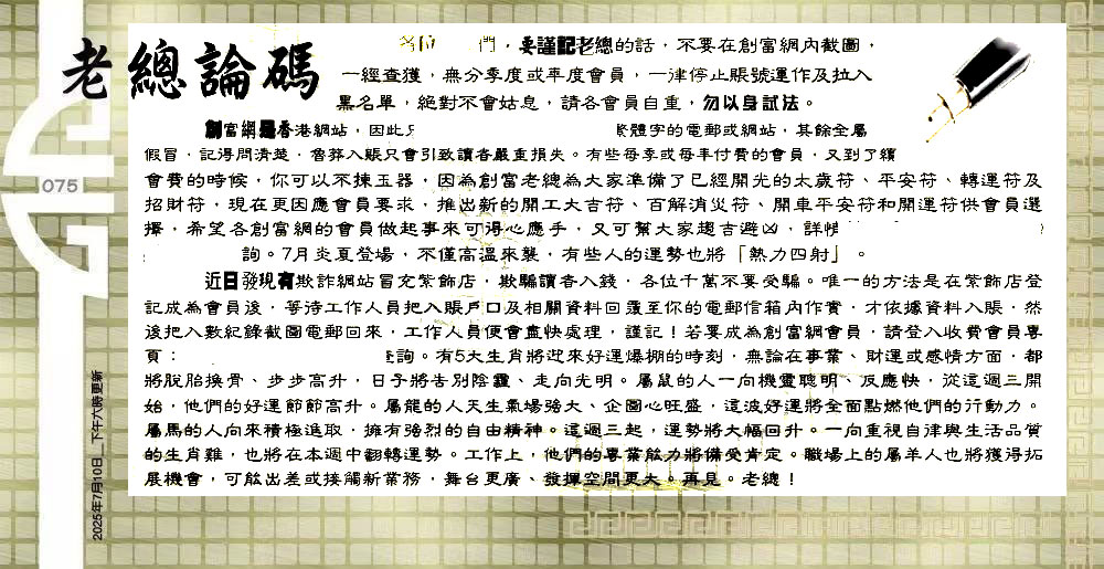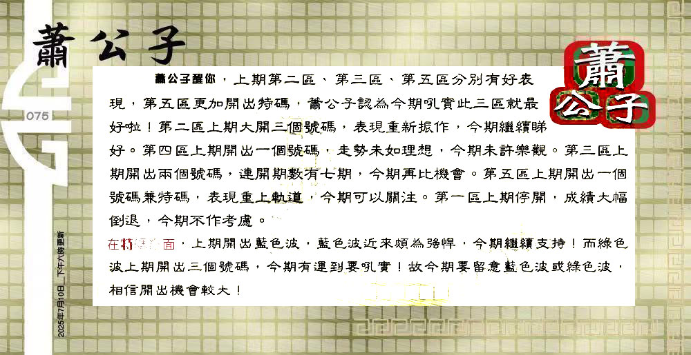 | 主题 :075期:六合皇金句/老总论码/萧公子/林大师/五行夺码/老总信箱截 |
