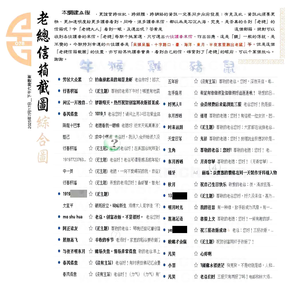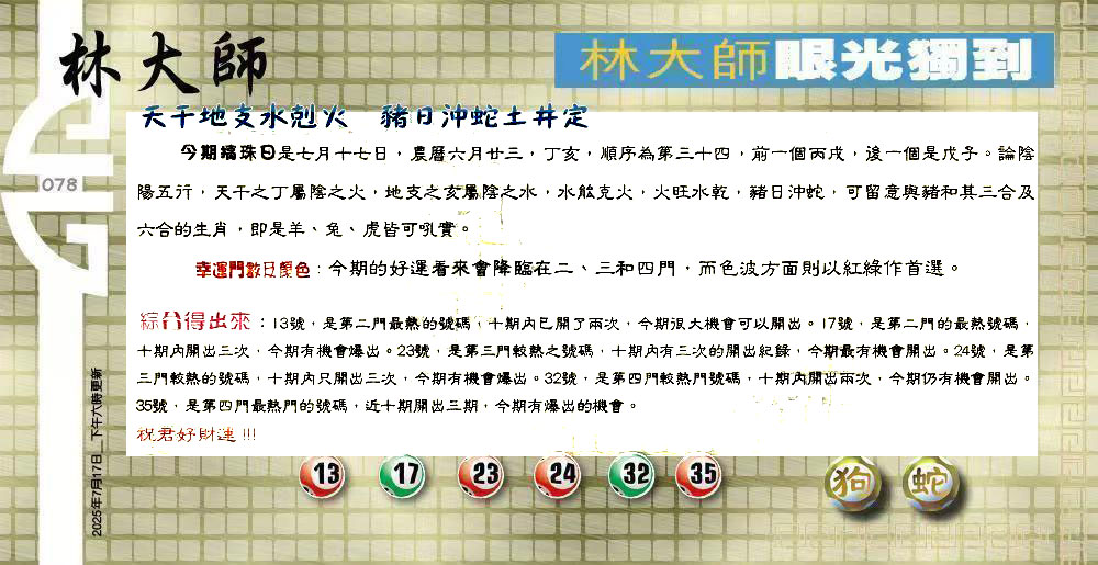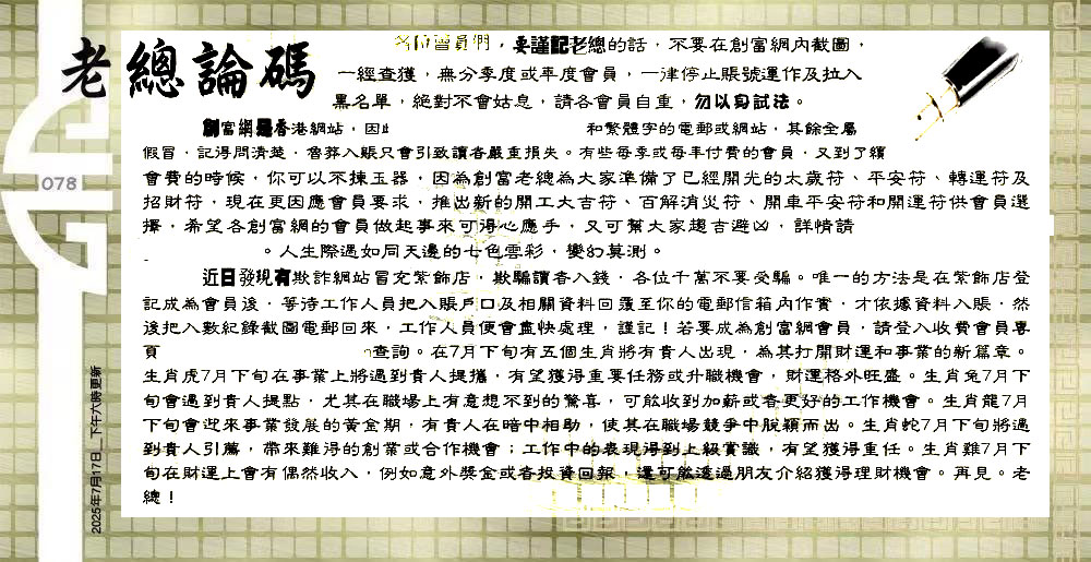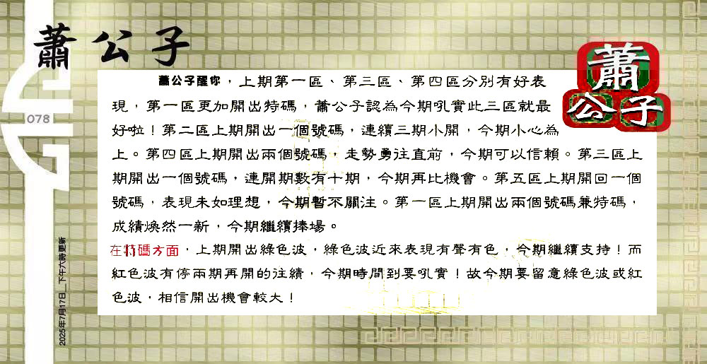 | 主题 :078期:六合皇金句/老总论码/萧公子/林大师/五行夺码/老总信箱截 |