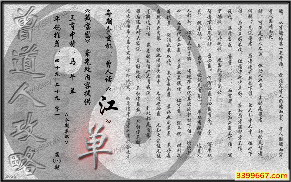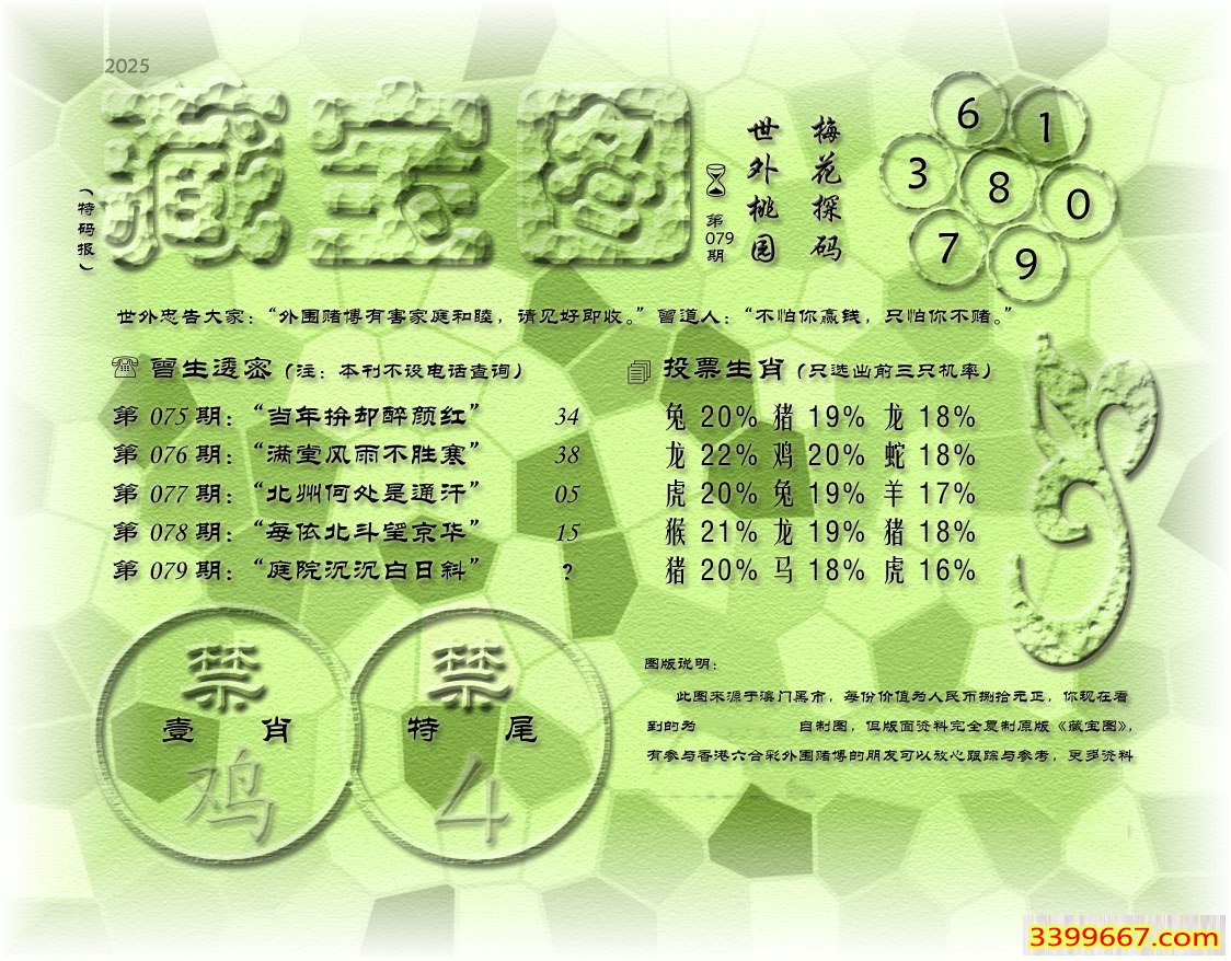 | 主题 :079期藏寶圖 新:暗黄摇曳陆桥云 老:庭院沉沉白日斜 禁:鸡 禁:4尾 |