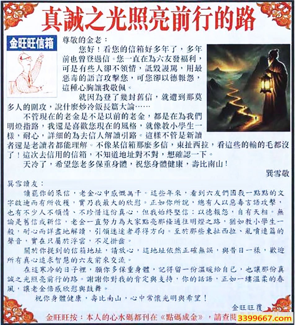 | 主题 :082期:金旺旺信箱彩民推荐→→《真誠之光照亮前行的路》 |