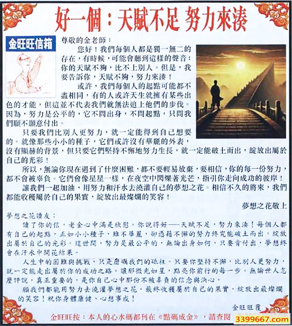 | 主题 :084期:金旺旺信箱彩民推荐→→《好一個:天賦不足 努力來湊》 |
