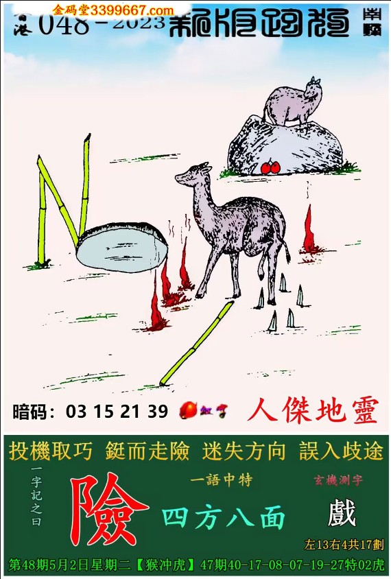 | 主题 : 048期:新版跑狗一字記之曰【險】 玄機測字:《戲》 |