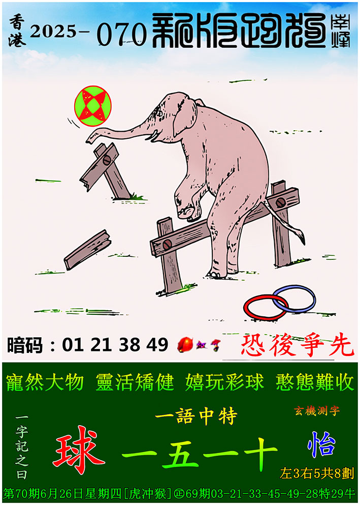 | 主题 :070期:新版跑狗一字記之曰【球】 玄機測字:【怡】 |