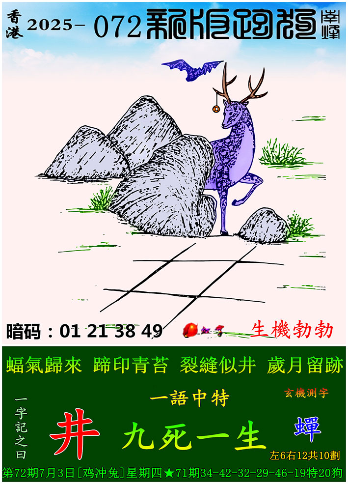 | 主题 :072期:新版跑狗一字記之曰【井】 玄機測字:【蟬】 |