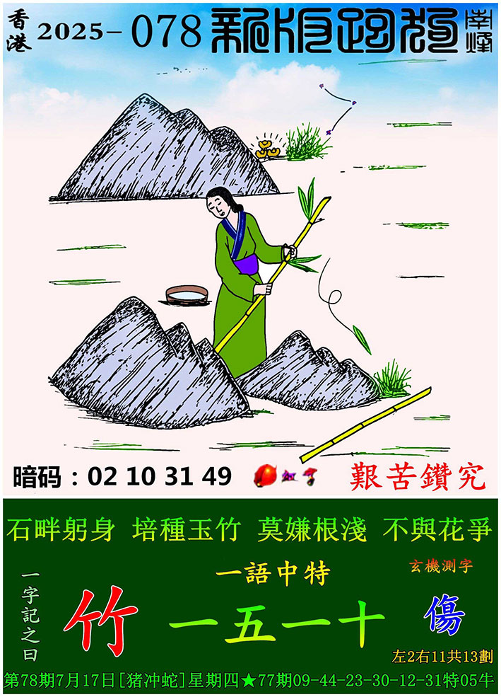 | 主题 :078期:新版跑狗一字記之曰【竹】 玄機測字:【傷】 |