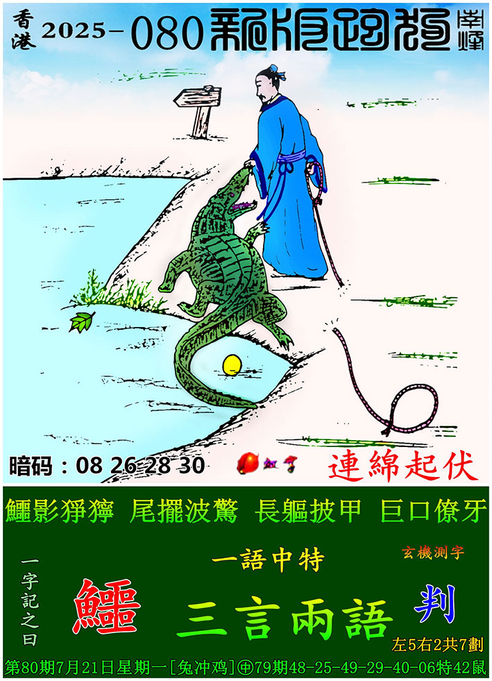 080期:新版跑狗一字記之曰【鱷】 玄機測字:【判】