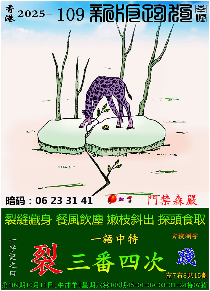 | 主题 :109期:新版跑狗一字記之曰【裂】 玄機測字:【踐】 |